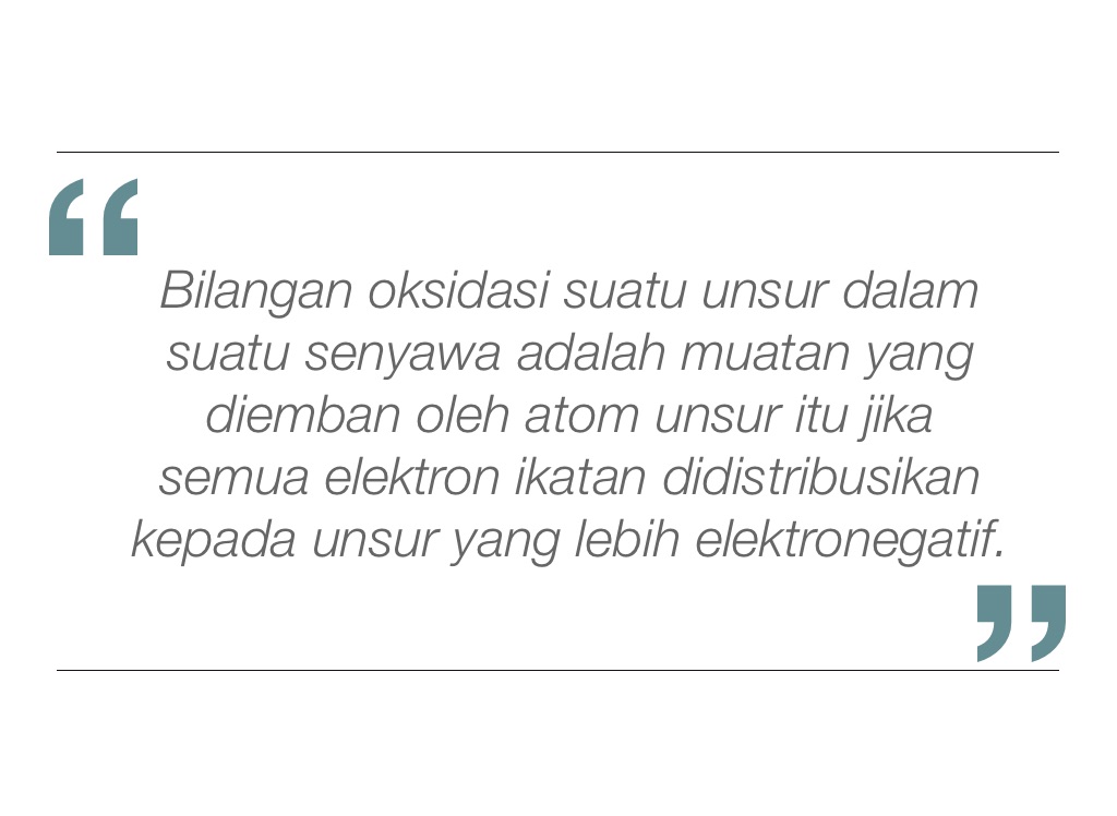 Bilangan oksidasi suatu unsur dalam suatu senyawa adalah muatan yang diemban oleh atom unsur itu jika semua elektron ikatan didistribusikan kepada unsur yang lebih elektronegatif.
