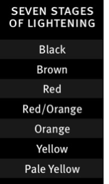 Melanin, when exposed to sun or lightening products, disap-pears from the hair. The stages of lightening are the colors that can
