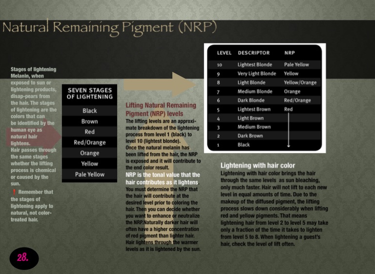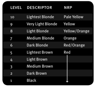 NRP is the tonal value that the hair contributes as it lightens. You must determine the NRP that the hair will contribute at the desired level prior to coloring the hair. Then you can decide whether you want to enhance or neutralize the NRP.Naturally darker hair will often have a higher concentration of red pigment than lighter hair. Hair lightens through the warmer levels as it is lightened by the sun.