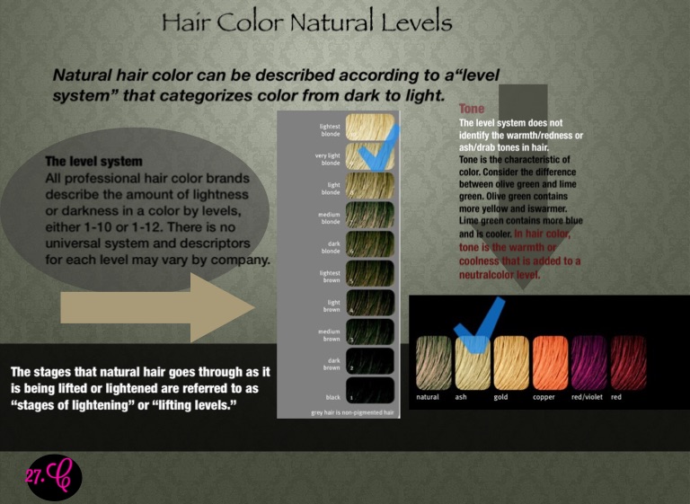 Natural hair color can be described according to a“level system” that categorizes color from dark to light.