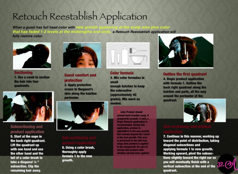 When a guest has full head color with new growth appearing at the scalp area plus color that has faded 1-2 levels at the midlengths and ends, a Retouch Reestablish application will fully restore color.