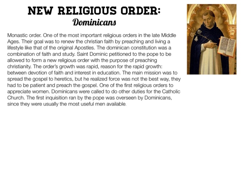Monastic order. One of the most important religious orders in the late Middle Ages. Their goal was to renew the christian faith by preaching and living a lifestyle like that of the original Apostles. The dominican constitution was a combination of faith and study. Saint Dominic petitioned to the pope to be allowed to form a new religious order with the purpose of preaching christianity. The order’s growth was rapid, reason for the rapid growth: between devotion of faith and interest in education. The main mission was to spread the gospel to heretics, but he realized force was not the best way, they had to be patient and preach the gospel. One of the first religious orders to appreciate women. Dominicans were called to do other duties for the Catholic Church. The first inquisition ran by the pope was overseen by Dominicans, since they were usually the most useful men available.