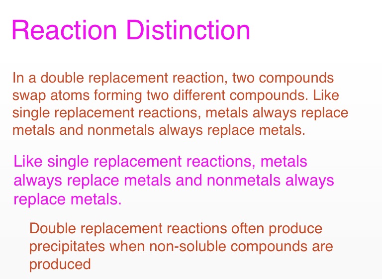 In a double replacement reaction, two compounds swap atoms forming two different compounds. Like single replacement reactions, metals always replace metals and nonmetals always replace metals.