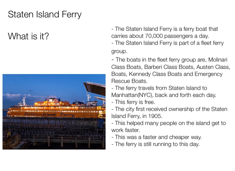 - The Staten Island Ferry is a ferry boat that carries about 70,000 passengers a day.