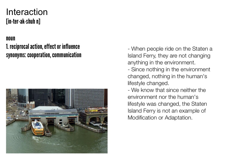 - We know that since neither the environment nor the human's lifestyle was changed, the Staten Island Ferry is not an example of Modification or Adaptation.