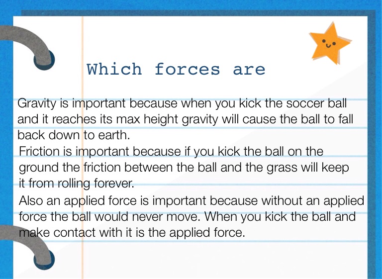 Also an applied force is important because without an applied force the ball would never move. When you kick the ball and make contact with it is the applied force.