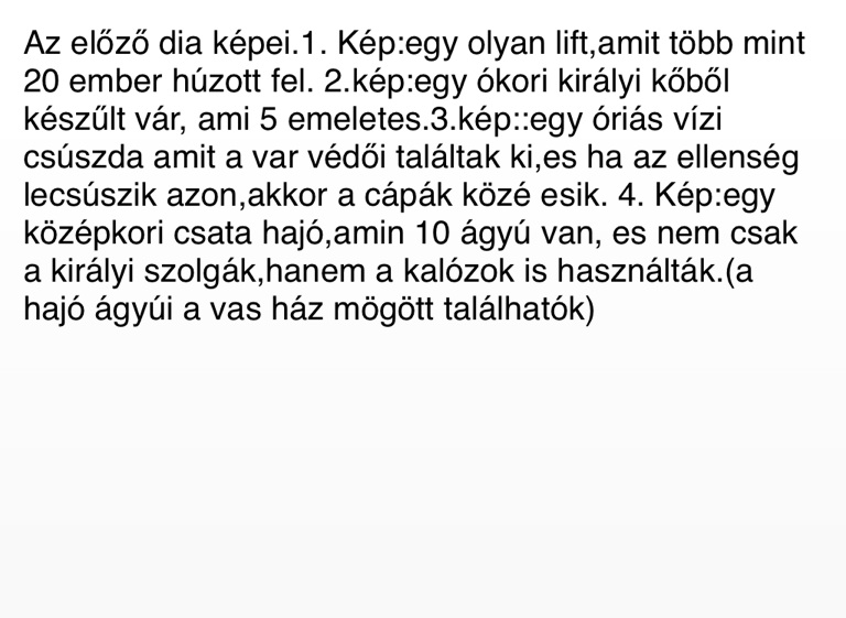 Az előző dia képei.1. Kép:egy olyan lift,amit több mint 20 ember húzott fel. 2.kép:egy ókori királyi kőből készűlt vár, ami 5 emeletes.3.kép::egy óriás vízi csúszda amit a var védői találtak ki,es ha az ellenség lecsúszik azon,akkor a cápák közé esik. 4. Kép:egy középkori csata hajó,amin 10 ágyú van, es nem csak a királyi szolgák,hanem a kalózok is használták.(a hajó ágyúi a vas ház mögött találhatók)