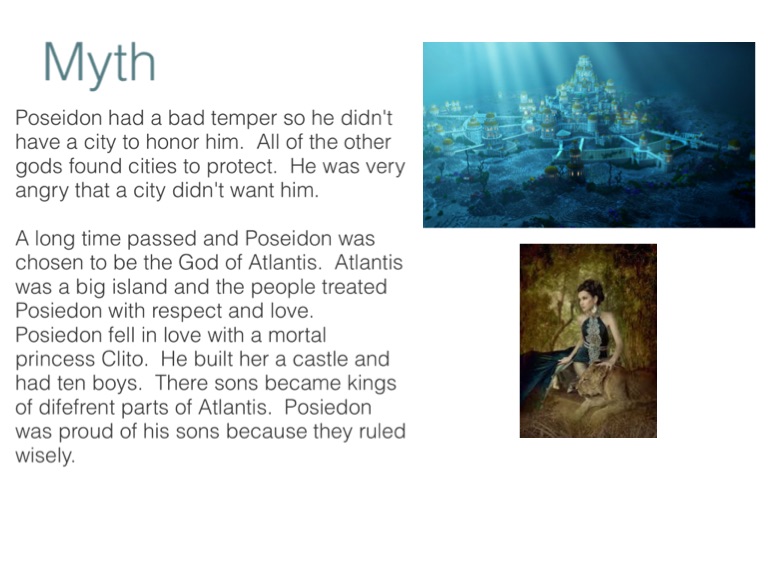 A long time passed and Poseidon was chosen to be the God of Atlantis. Atlantis was a big island and the people treated Posiedon with respect and love. Posiedon fell in love with a mortal princess Clito. He built her a castle and had ten boys. There sons became kings of difefrent parts of Atlantis. Posiedon was proud of his sons because they ruled wisely.