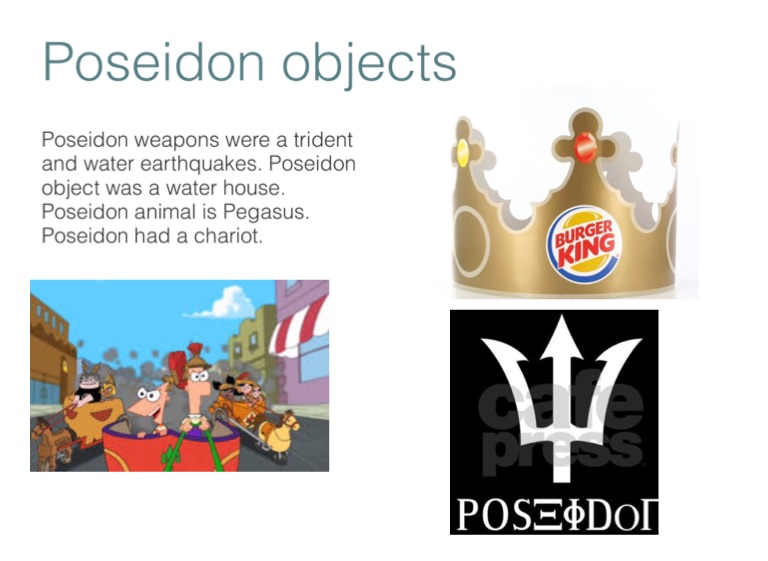 Poseidon weapons were a trident and water earthquakes. Poseidon object was a water house. Poseidon animal is Pegasus. Poseidon had a chariot.