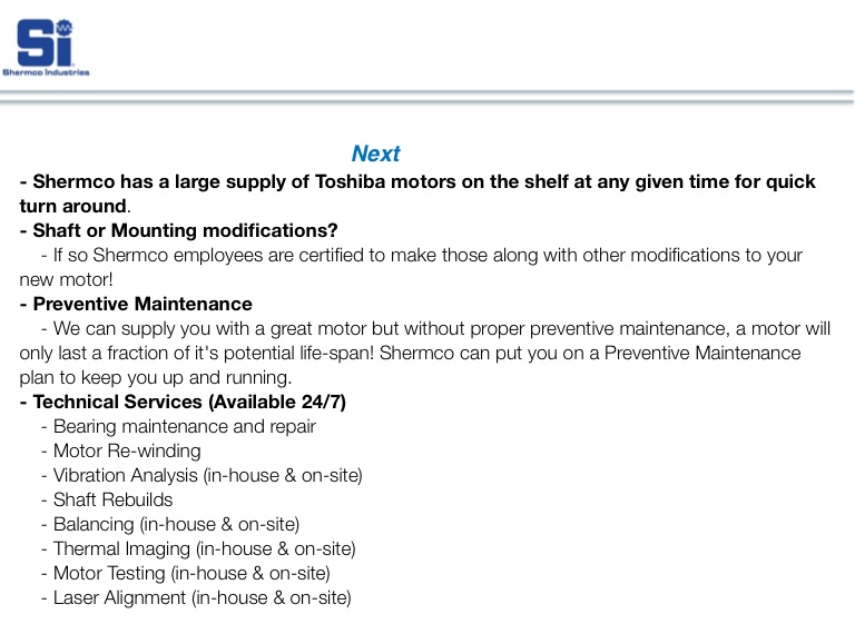 - Shermco has a large supply of Toshiba motors on the shelf at any given time for quick turn around.