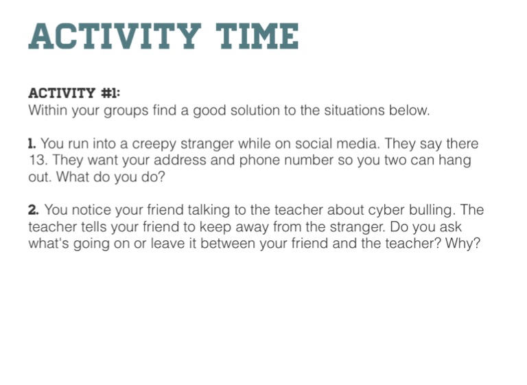 1. You run into a creepy stranger while on social media. They say there 13. They want your address and phone number so you two can hang out. What do you do?