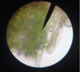 This is grass zoomed in on 100x. You can see some cells, although most of the bubbles are just from the water. The green in it is from the chlorophyll, but the edges doesn't have any green because chlorophyll isn't that far out in the strand of grass.