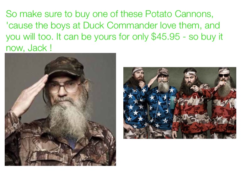 So make sure to buy one of these Potato Cannons, 'cause the boys at Duck Commander love them, and you will too. It can be yours for only $45.95 - so buy it now, Jack !
