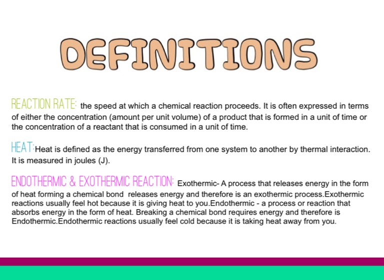 Reaction rate: the speed at which a chemical reaction proceeds. It is often expressed in terms of either the concentration (amount per unit volume) of a product that is formed in a unit of time or the concentration of a reactant that is consumed in a unit of time.