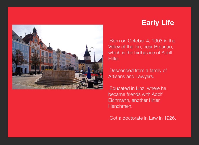 .Educated in Linz, where he became friends with Adolf Eichmann, another Hitler Henchmen.