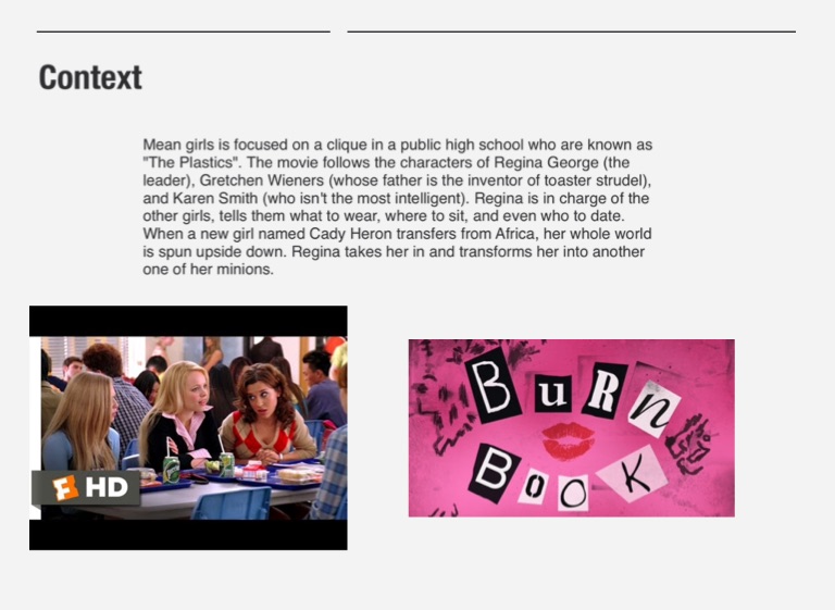 Mean girls is focused on a clique in a public high school who are known as "The Plastics". The movie follows the characters of Regina George (the leader), Gretchen Wieners (whose father is the inventor of toaster strudel), and Karen Smith (who isn't the most intelligent). Regina is in charge of the other girls, tells them what to wear, where to sit, and even who to date. When a new girl named Cady Heron transfers from Africa, her whole world is spun upside down. Regina takes her in and transforms her into another one of her minions.