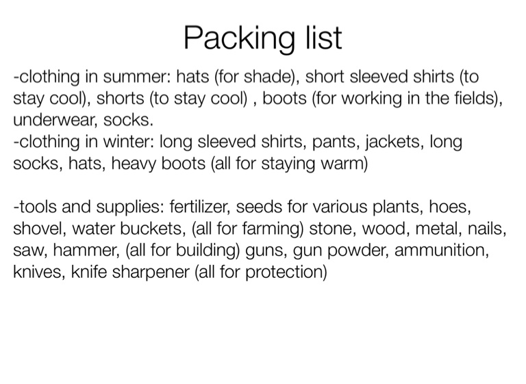 -tools and supplies: fertilizer, seeds for various plants, hoes, shovel, water buckets, (all for farming) stone, wood, metal, nails, saw, hammer, (all for building) guns, gun powder, ammunition, knives, knife sharpener (all for protection)