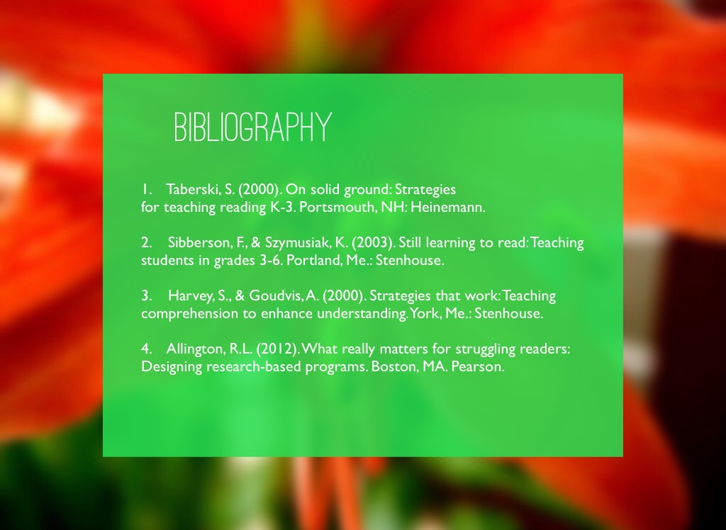 4. Allington, R.L. (2012). What really matters for struggling readers: Designing research-based programs. Boston, MA. Pearson.