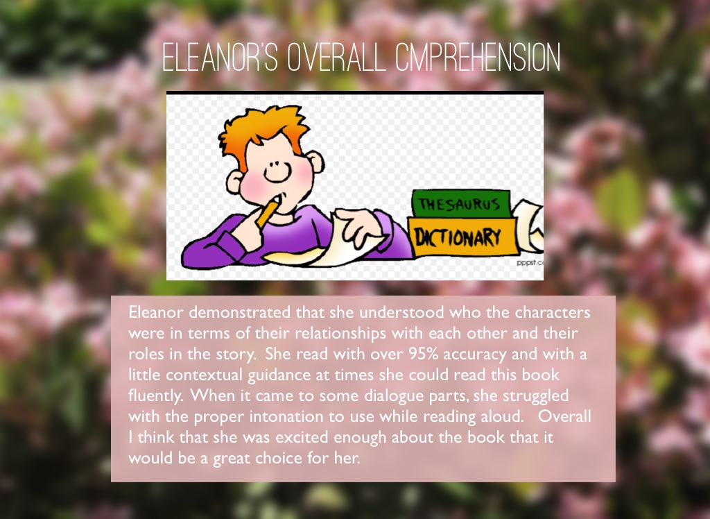 Eleanor demonstrated that she understood who the characters were in terms of their relationships with each other and their roles in the story. She read with over 95% accuracy and with a little contextual guidance at times she could read this book fluently. When it came to some dialogue parts, she struggled with the proper intonation to use while reading aloud. Overall I think that she was excited enough about the book that it would be a great choice for her.