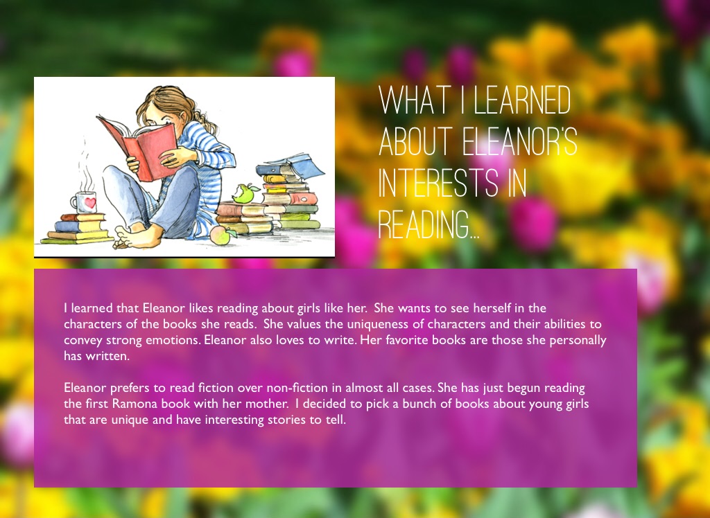 I learned that Eleanor likes reading about girls like her. She wants to see herself in the characters of the books she reads. She values the uniqueness of characters and their abilities to convey strong emotions. Eleanor also loves to write. Her favorite books are those she personally has written.