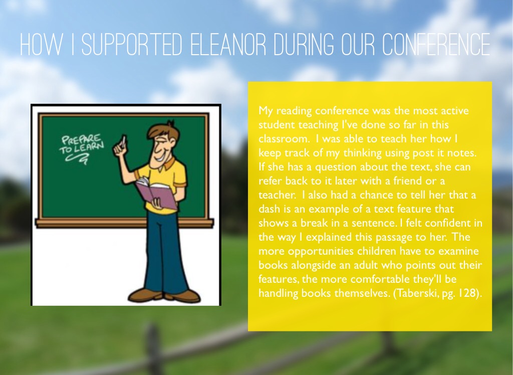 My reading conference was the most active student teaching I've done so far in this classroom. I was able to teach her how I keep track of my thinking using post it notes. If she has a question about the text, she can refer back to it later with a friend or a teacher. I also had a chance to tell her that a dash is an example of a text feature that shows a break in a sentence. I felt confident in the way I explained this passage to her. The more opportunities children have to examine books alongside an adult who points out their features, the more comfortable they'll be handling books themselves. (Taberski, pg. 128).