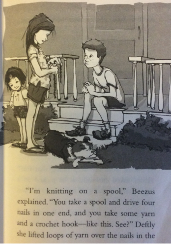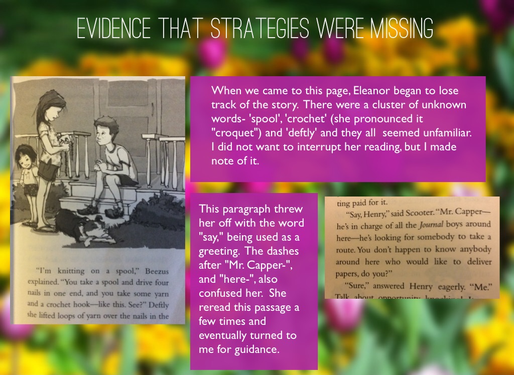 When we came to this page, Eleanor began to lose track of the story. There were a cluster of unknown words- 'spool', 'crochet' (she pronounced it "croquet") and 'deftly' and they all seemed unfamiliar. I did not want to interrupt her reading, but I made note of it.