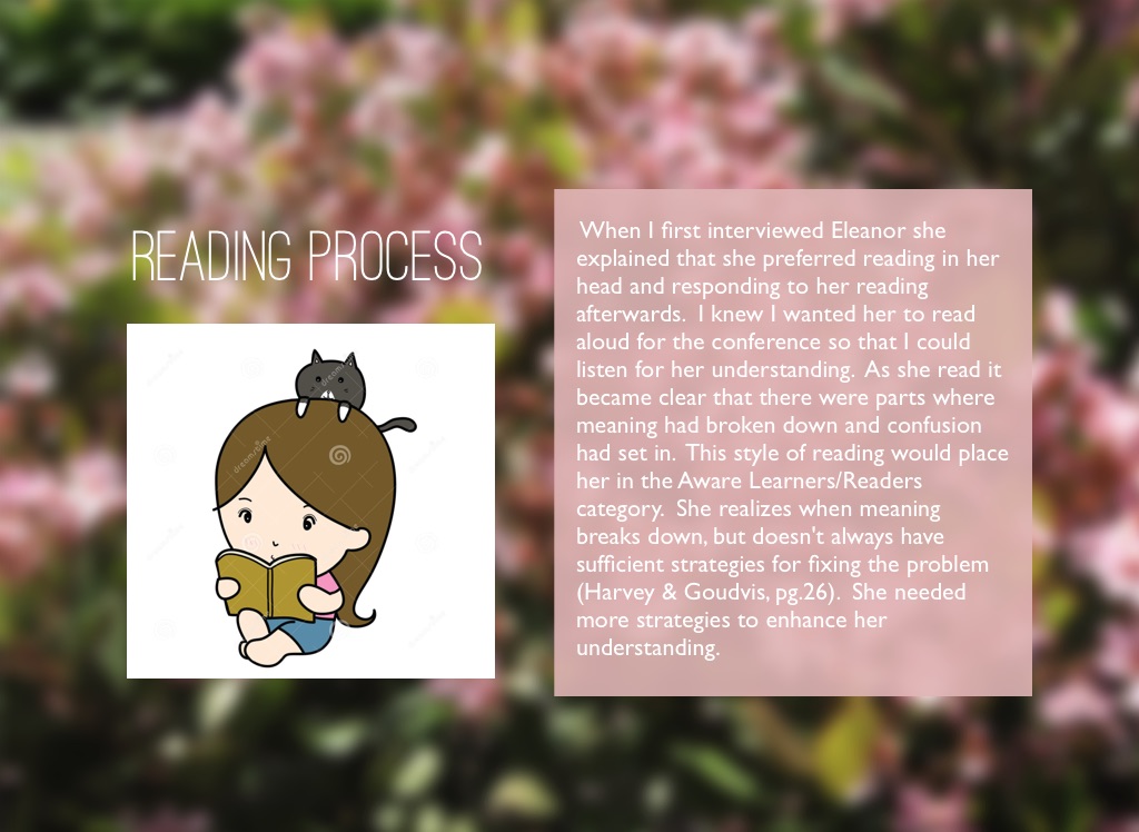 When I first interviewed Eleanor she explained that she preferred reading in her head and responding to her reading afterwards. I knew I wanted her to read aloud for the conference so that I could listen for her understanding. As she read it became clear that there were parts where meaning had broken down and confusion had set in. This style of reading would place her in the Aware Learners/Readers category. She realizes when meaning breaks down, but doesn't always have sufficient strategies for fixing the problem (Harvey & Goudvis, pg.26). She needed more strategies to enhance her understanding.