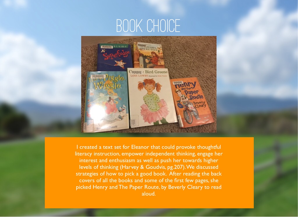 I created a text set for Eleanor that could provoke thoughtful literacy instruction, empower independent thinking, engage her interest and enthusiasm as well as push her towards higher levels of thinking (Harvey & Goudvis, pg.207). We discussed strategies of how to pick a good book. After reading the back covers of all the books and some of the first few pages, she picked Henry and The Paper Route, by Beverly Cleary to read aloud.