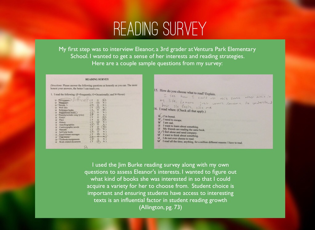 I used the Jim Burke reading survey along with my own questions to assess Eleanor's interests. I wanted to figure out what kind of books she was interested in so that I could acquire a variety for her to choose from. Student choice is important and ensuring students have access to interesting texts is an influential factor in student reading growth (Allington, pg. 73)