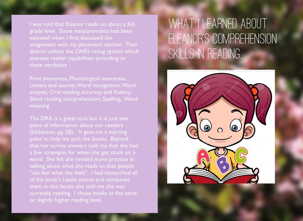 I was told that Eleanor reads on about a 5th grade level. Some measurements had been assessed when I first discussed the assignment with my placement teacher. Their district utilizes the DARS rating system which assesses reader capabilities according to these attributes :