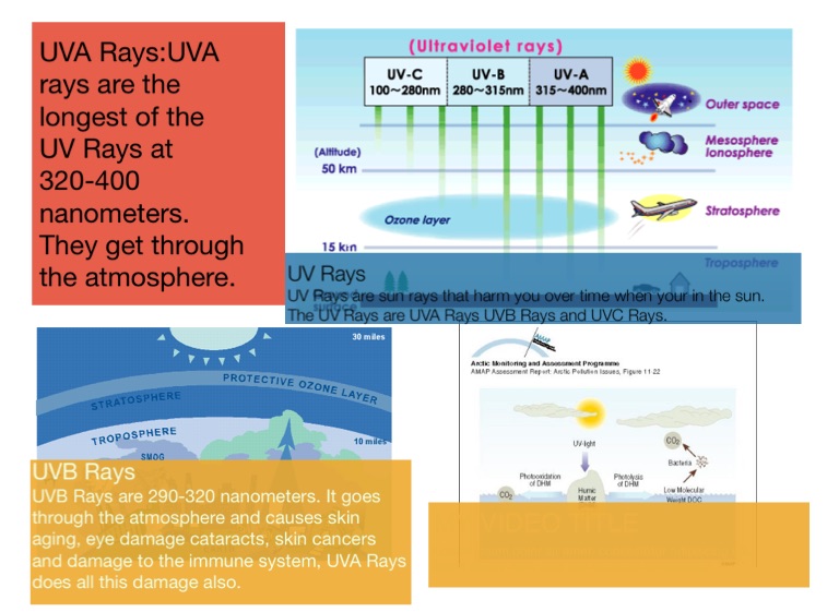 UVA Rays:UVA rays are the longest of the UV Rays at 320-400 nanometers. They get through the atmosphere.