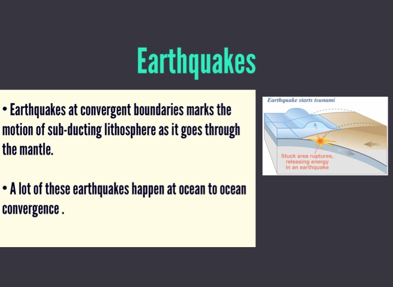 • Earthquakes at convergent boundaries marks the motion of sub-ducting lithosphere as it goes through the mantle.
