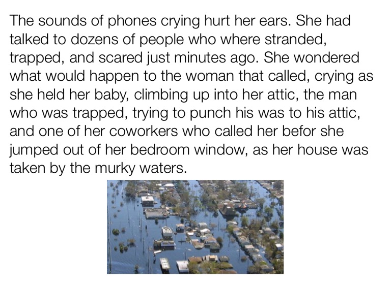 The sounds of phones crying hurt her ears. She had talked to dozens of people who where stranded, trapped, and scared just minutes ago. She wondered what would happen to the woman that called, crying as she held her baby, climbing up into her attic, the man who was trapped, trying to punch his was to his attic, and one of her coworkers who called her befor she jumped out of her bedroom window, as her house was taken by the murky waters.