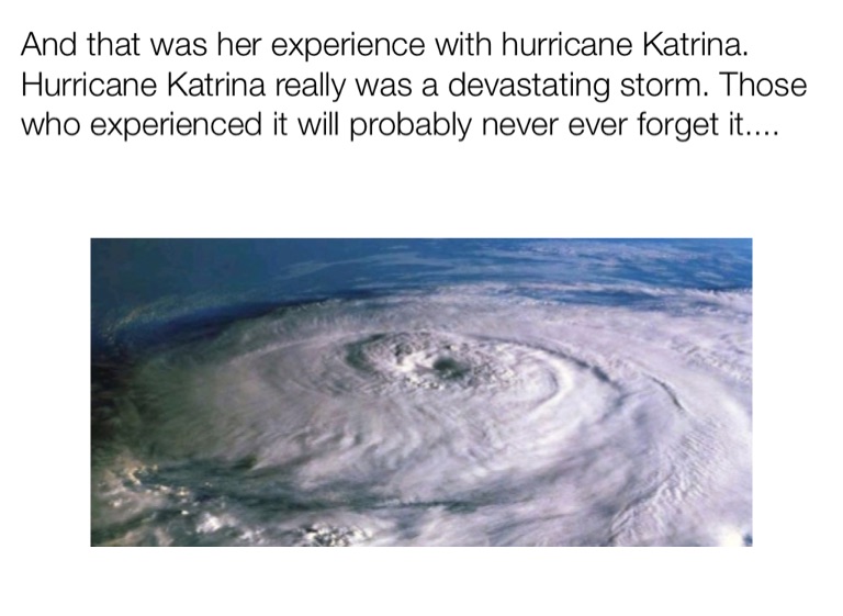 And that was her experience with hurricane Katrina. Hurricane Katrina really was a devastating storm. Those who experienced it will probably never ever forget it....