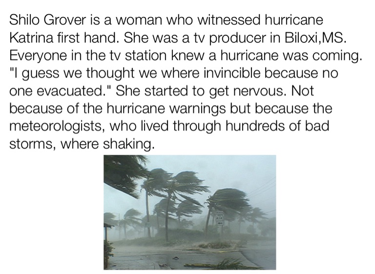 Shilo Grover is a woman who witnessed hurricane Katrina first hand. She was a tv producer in Biloxi,MS.