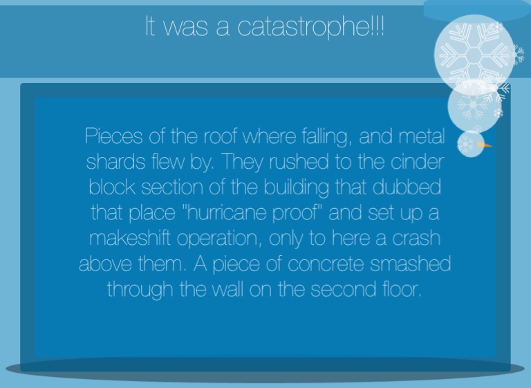 Pieces of the roof where falling, and metal shards flew by. They rushed to the cinder block section of the building that dubbed that place "hurricane proof" and set up a makeshift operation, only to here a crash above them. A piece of concrete smashed through the wall on the second floor.