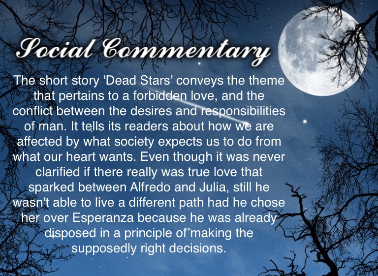 The short story 'Dead Stars' conveys the theme that pertains to a forbidden love, and the conflict between the desires and responsibilities of man. It tells its readers about how we are affected by what society expects us to do from what our heart wants. Even though it was never clarified if there really was true love that sparked between Alfredo and Julia, still he wasn't able to live a different path had he chose her over Esperanza because he was already disposed in a principle of making the supposedly right decisions.