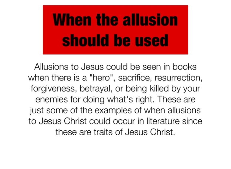 Allusions to Jesus could be seen in books when there is a "hero", sacrifice, resurrection, forgiveness, betrayal, or being killed by your enemies for doing what's right. These are just some of the examples of when allusions to Jesus Christ could occur in literature since these are traits of Jesus Christ.