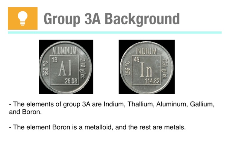 - The elements of group 3A are Indium, Thallium, Aluminum, Gallium, and Boron.