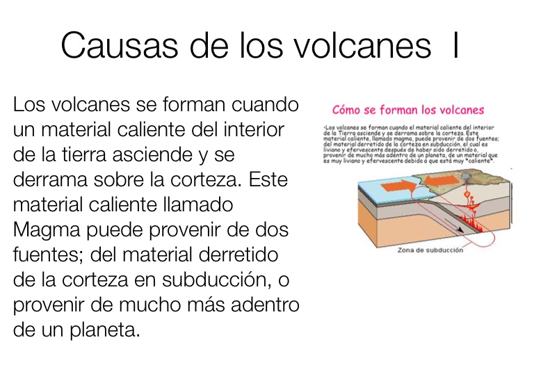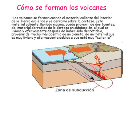 Los volcanes se forman cuando un material caliente del interior de la tierra asciende y se derrama sobre la corteza. Este material caliente llamado Magma puede provenir de dos fuentes; del material derretido de la corteza en subducción, o provenir de mucho más adentro de un planeta.