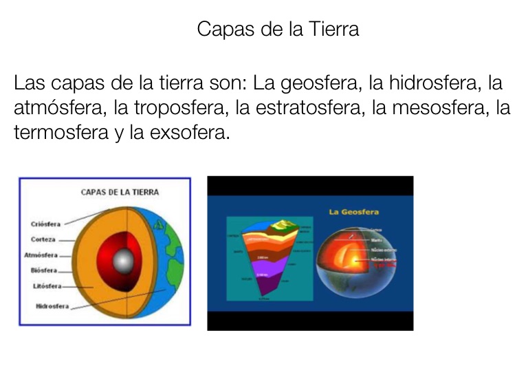 Las capas de la tierra son: La geosfera, la hidrosfera, la atmósfera, la troposfera, la estratosfera, la mesosfera, la termosfera y la exsofera.