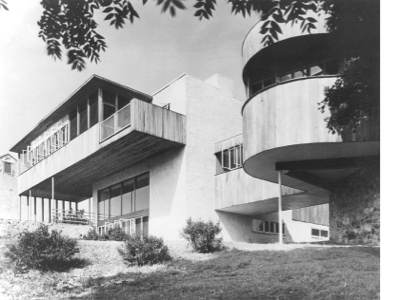 There isn't much decoration, it has very smooth features. It has an asymmetrical façade and ribbon windows.