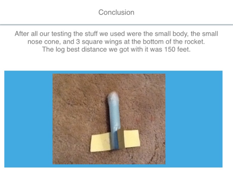 After all our testing the stuff we used were the small body, the small nose cone, and 3 square wings at the bottom of the rocket.