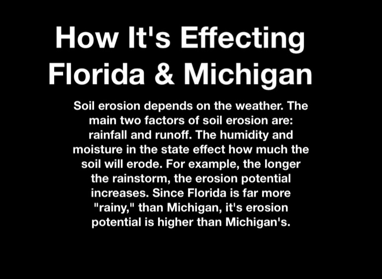 Soil erosion depends on the weather. The main two factors of soil erosion are: rainfall and runoff. The humidity and moisture in the state effect how much the soil will erode. For example, the longer the rainstorm, the erosion potential increases. Since Florida is far more "rainy," than Michigan, it's erosion potential is higher than Michigan's.