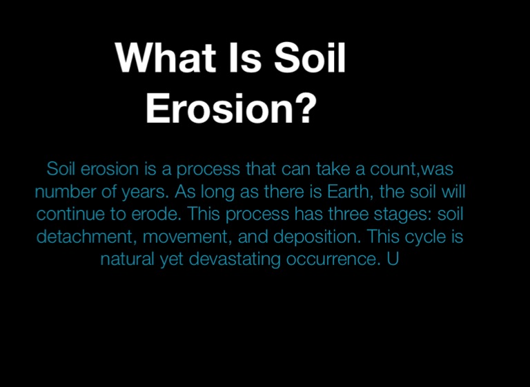 Soil erosion is a process that can take a count,was number of years. As long as there is Earth, the soil will continue to erode. This process has three stages: soil detachment, movement, and deposition. This cycle is natural yet devastating occurrence. U