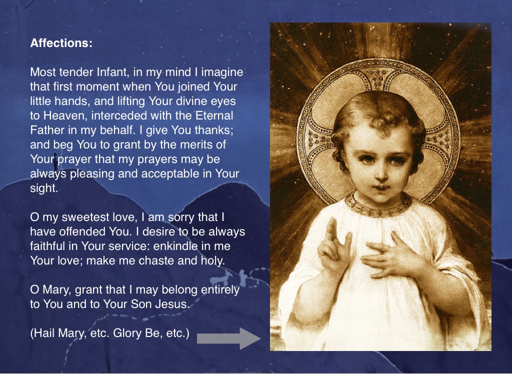 Most tender Infant, in my mind I imagine that first moment when You joined Your little hands, and lifting Your divine eyes to Heaven, interceded with the Eternal Father in my behalf. I give You thanks; and beg You to grant by the merits of Your prayer that my prayers may be always pleasing and acceptable in Your sight.