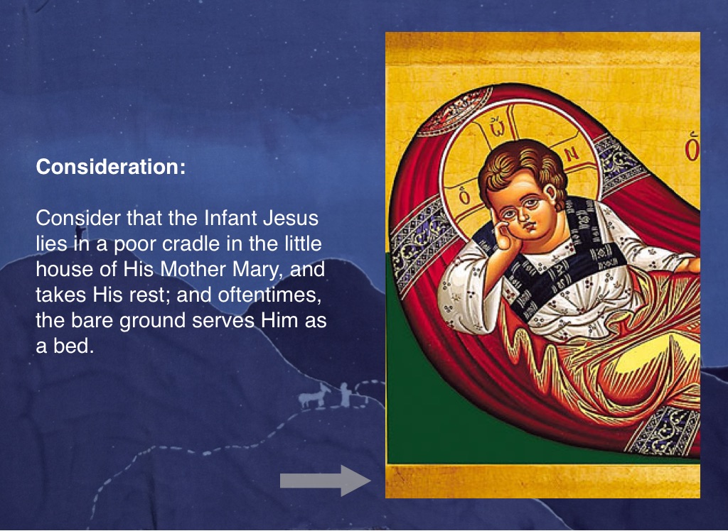 Consider that the Infant Jesus lies in a poor cradle in the little house of His Mother Mary, and takes His rest; and oftentimes, the bare ground serves Him as a bed.