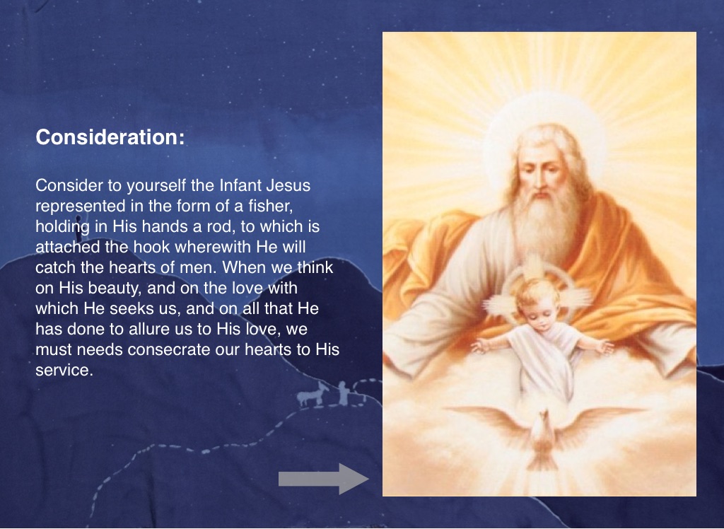 Consider to yourself the Infant Jesus represented in the form of a fisher, holding in His hands a rod, to which is attached the hook wherewith He will catch the hearts of men. When we think on His beauty, and on the love with which He seeks us, and on all that He has done to allure us to His love, we must needs consecrate our hearts to His service.