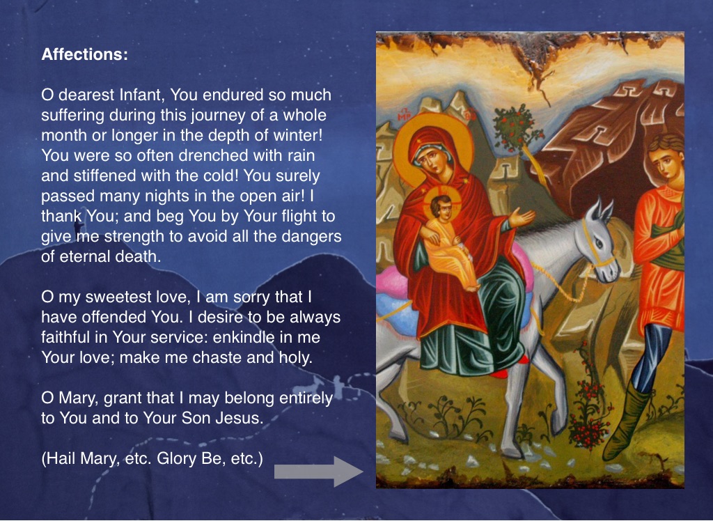 O dearest Infant, You endured so much suffering during this journey of a whole month or longer in the depth of winter! You were so often drenched with rain and stiffened with the cold! You surely passed many nights in the open air! I thank You; and beg You by Your flight to give me strength to avoid all the dangers of eternal death.