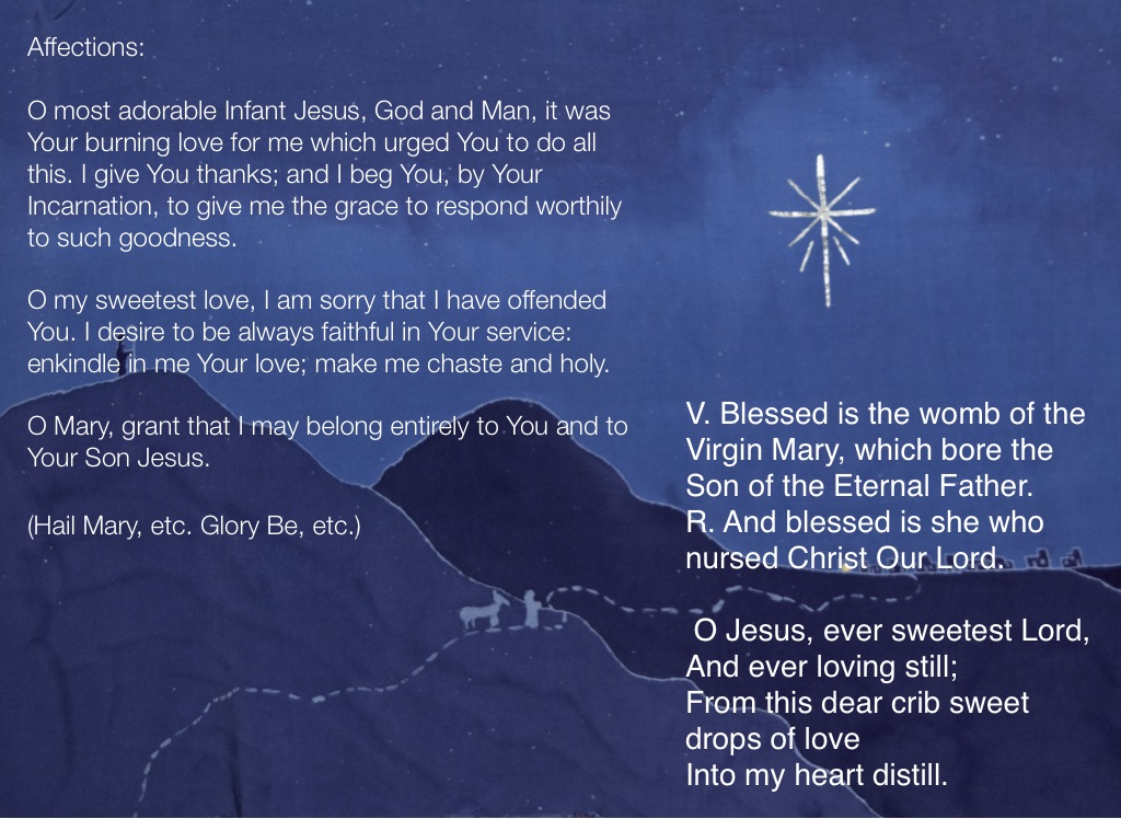 O most adorable Infant Jesus, God and Man, it was Your burning love for me which urged You to do all this. I give You thanks; and I beg You, by Your Incarnation, to give me the grace to respond worthily to such goodness.